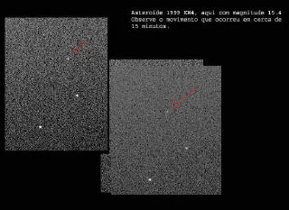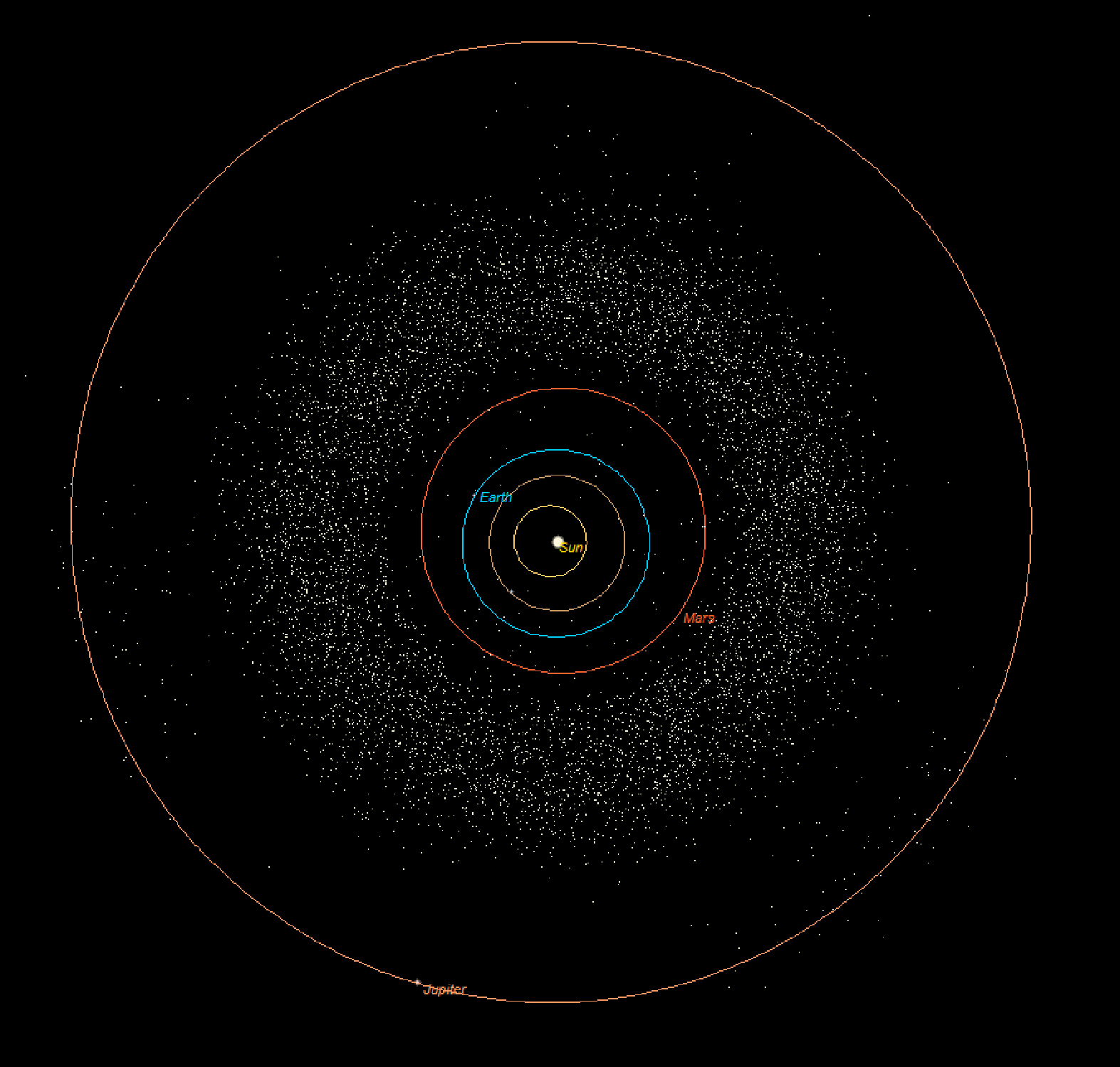 Asteróides - Pedras Errantes no EspaçoEsses fantásticos objetos estão situados, tipicamente, entre as órbitas de Marte e Júpiter. Sua origem ainda é controversa, mas provavelmente devem ter surgido nas origens do nosso sistema solar. De fato, existem diversas famílias de asteróides. Cada família é composta por asteróides de órbitas similares. Hoje em dia a família dos NEO ( Near Earth Objects ), asteróides que passam rasante à Terra, é das mais interessantes a serem observadas. Acompanhar o movimento de um asteróide em um telescópio é algo muito interessante. Em trinta minutos podemos vê-los mudando de posição em relação às estrelas. Abaixo vemos a órbita de Júpiter ( a mais externa) e as de Marte (vermelho), Terra (Azul), Venus e Mercúrio. Os mais brilhantes têm magnitude entre 7 e 9 na maior parte do ano, sendo observáveis com binóculos ou pequenos telescópios. Para saber onde estão temos que usar programas de computador.