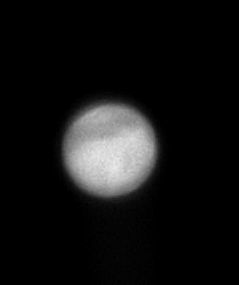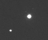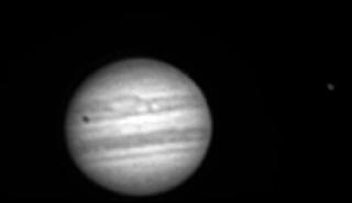 Aqui vemos uma interessante imagem de júpiter e sua grande mancha vermelha. O detalhe é a sombra de Io no planeta. Agora perceba o próprio Io no canto direito da imagem...